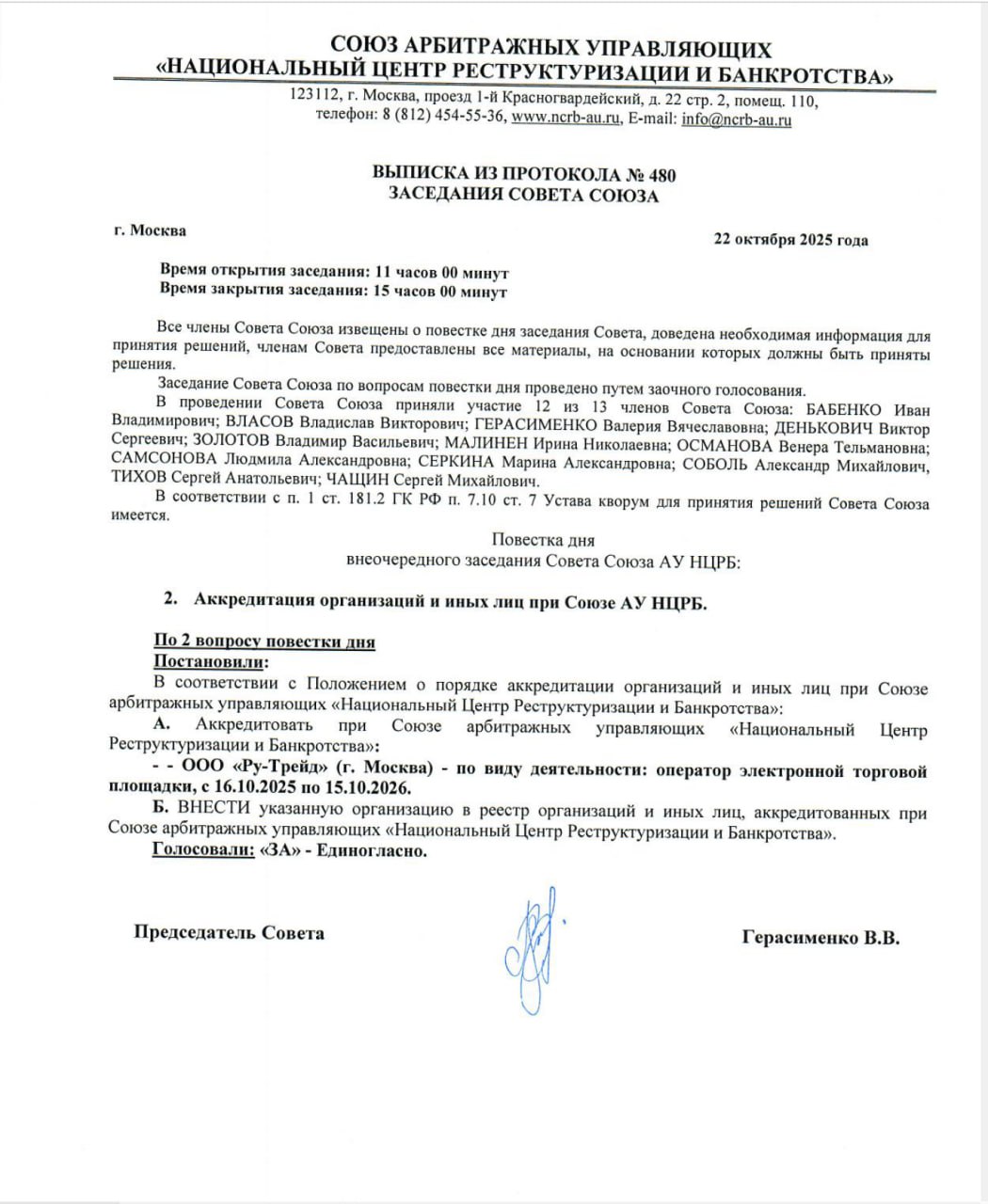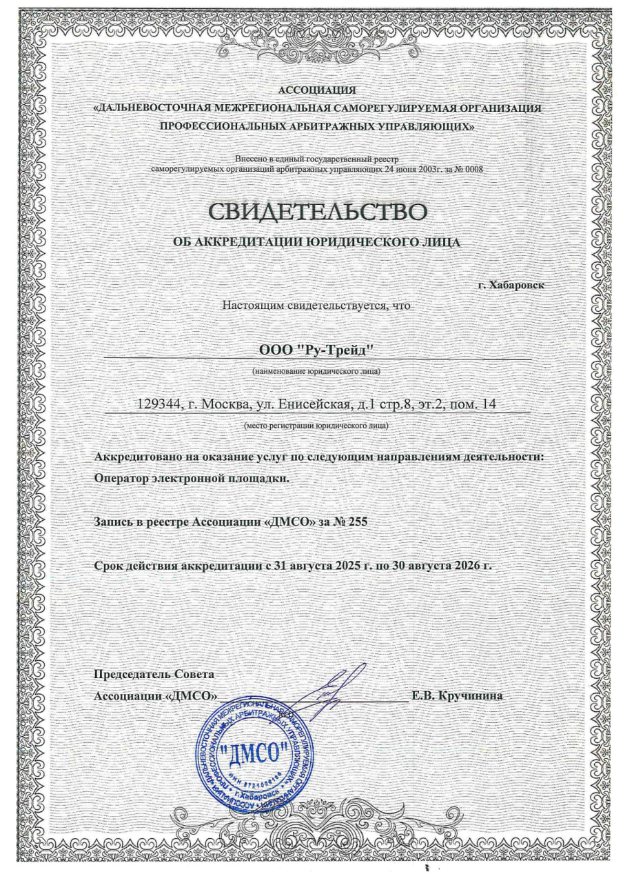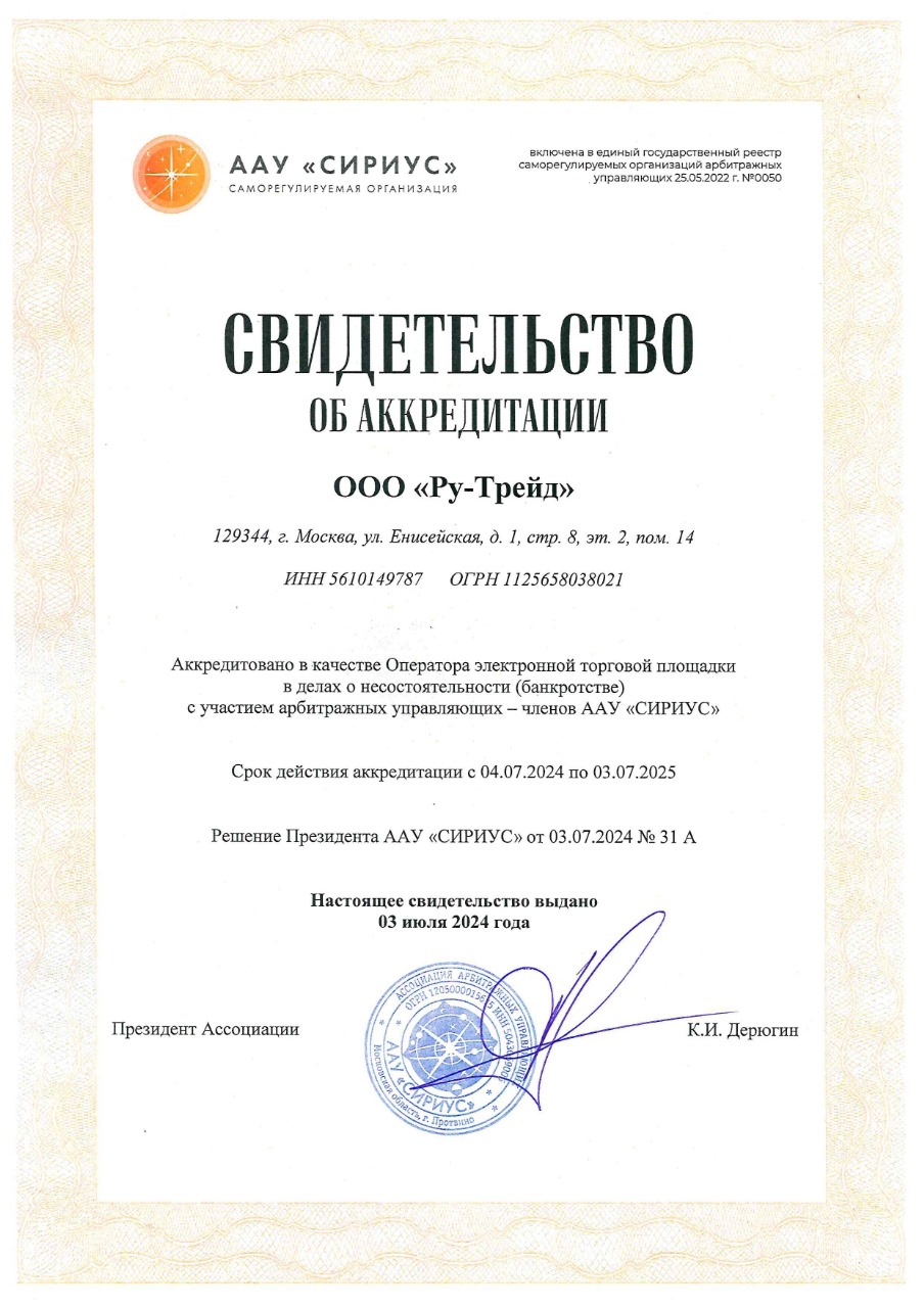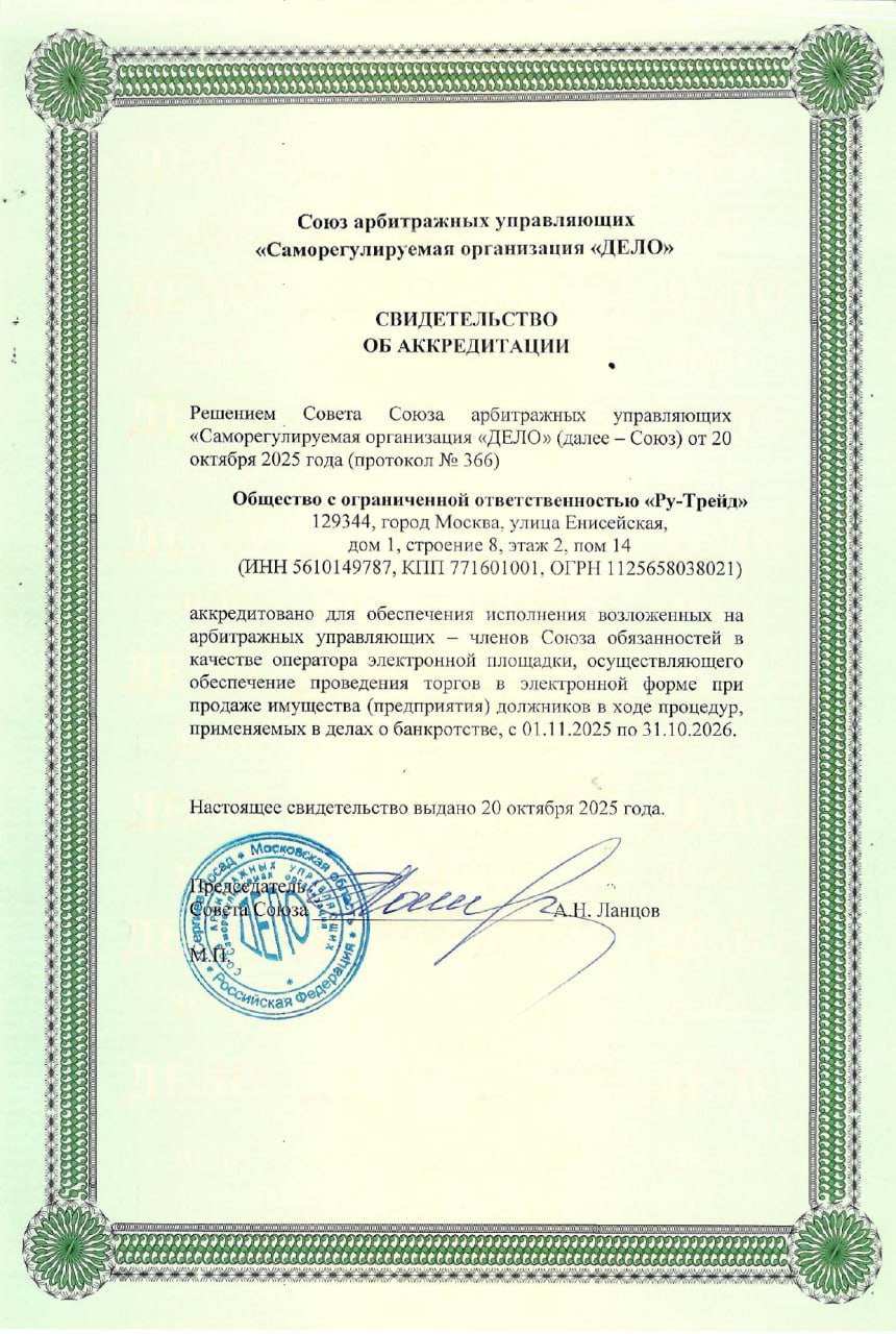 Аккредитация при Союзе арбитражных управляющих «Национальный центр реструктуризации и банкротства» с 16.10.2024г. по 15.10.2025г.
