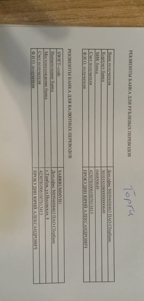 р/с - ФИО получателя Прокудин Юрий Александрович № 42307810061007613413 в ПАО Сбербанк, доп. Офис № 8594/08463, БИК 046850649, Кор/сч: 30101810800000000649