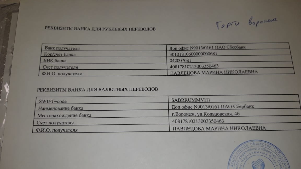 р/с - ФИО получателя Павлецова Марина Николаевна № 40817810213002250463 в ПАО Сбербанк, доп. Офис № 9013/0161, БИК 042007681, Кор/сч: 30101810600000000681