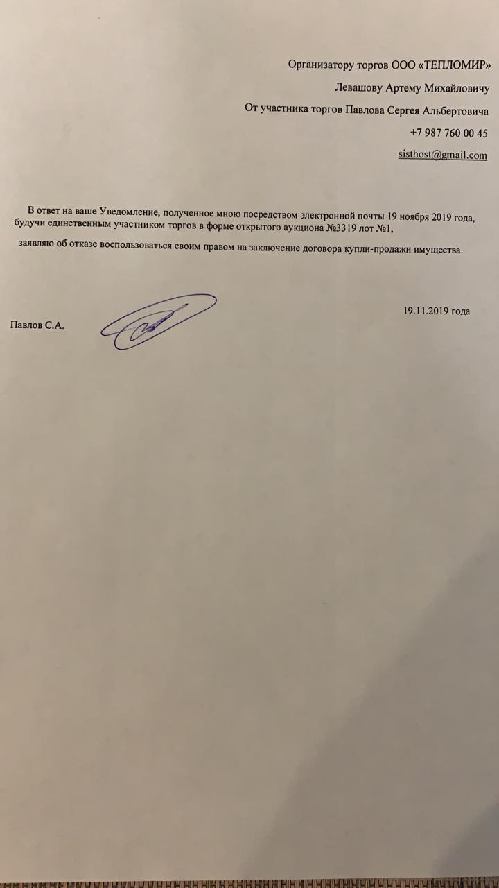 Участник торгов Павлов Сергей Альбертович (ИНН: 211901144499 , 125363, Россия, г. Москва, бульвар генерала Карбышева, д. 19, к.5 кв.43) отказался заключить договор купли-продажи имущества в соответствии с условиями торгов.