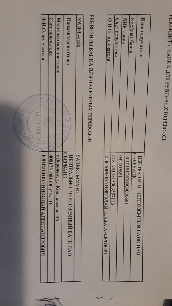 Для участия в торгах заявитель должен внести задаток в размере 10 (десять) процентов от начальной цены продажи Имущества в счет обеспечения оплаты Имущества Должника на счет, определенный Организатором торгов и указанный в информационном сообщении. Задаток должен быть внесен заявителем в срок, обеспечивающий его поступление на счет, указанный в информационном сообщении до даты окончания приема заявок на участие в торгах. Суммы внесенных заявителями задатков возвращаются всем заявителям, за исключением победителя торгов, в течение 5 (пяти) рабочих дней со дня подписания протокола о результатах проведения торгов, за минусом банковской комиссии взимаемой за перевод денежных средств (суммы задатка) от финансового управляющего на счет заявителя (участника торгов). р/с - ФИО получателя Клименко Николай Александрович № 40817810813003557116 в ПАО Сбербанк, Центрально - Черноземный банк, БИК 042007681, Кор/сч: 30101810600000000681
