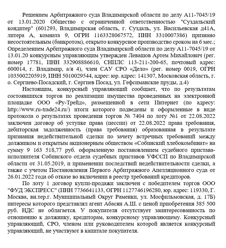 дебиторская задолженность (права требования) образованная в результате признания недействительной сделки по зачету встречных требований между должником и открытым акционерным обществом «Собинский хлебокомбинат» на сумму 9 163 518,77 руб. оформленную постановлением судебного пристава-исполнителя Собинского отдела судебных приставов УФССП по Владимирской области от 31.05.2019, и применении последствий недействительности сделки, а также с учетом Постановления Первого Арбитражного Апелляционного суда от 26.01.2022 года об отказе во включении в реестр требований кредиторов. Исполнительный лист отсутствует.Ознакомление с имуществом и имеющейся документацией осуществляется по адресу: г. Владимир, ул. Чайковского д.14 оф. 303 с даты приема заявок и до окончания периода приема заявок по будням с 11:00 ч. до 17:00 ч. (мск; обед с 13:00 ч. до 14:00 ч.) по предварительной записи в указанное время по тел. +79107763339 почтовый адрес: 600014, г. Владимир, а/я 4 для Левашова А.М. Адрес электронной почты: am_levashov@bk.ru